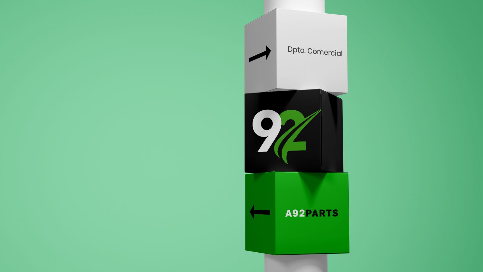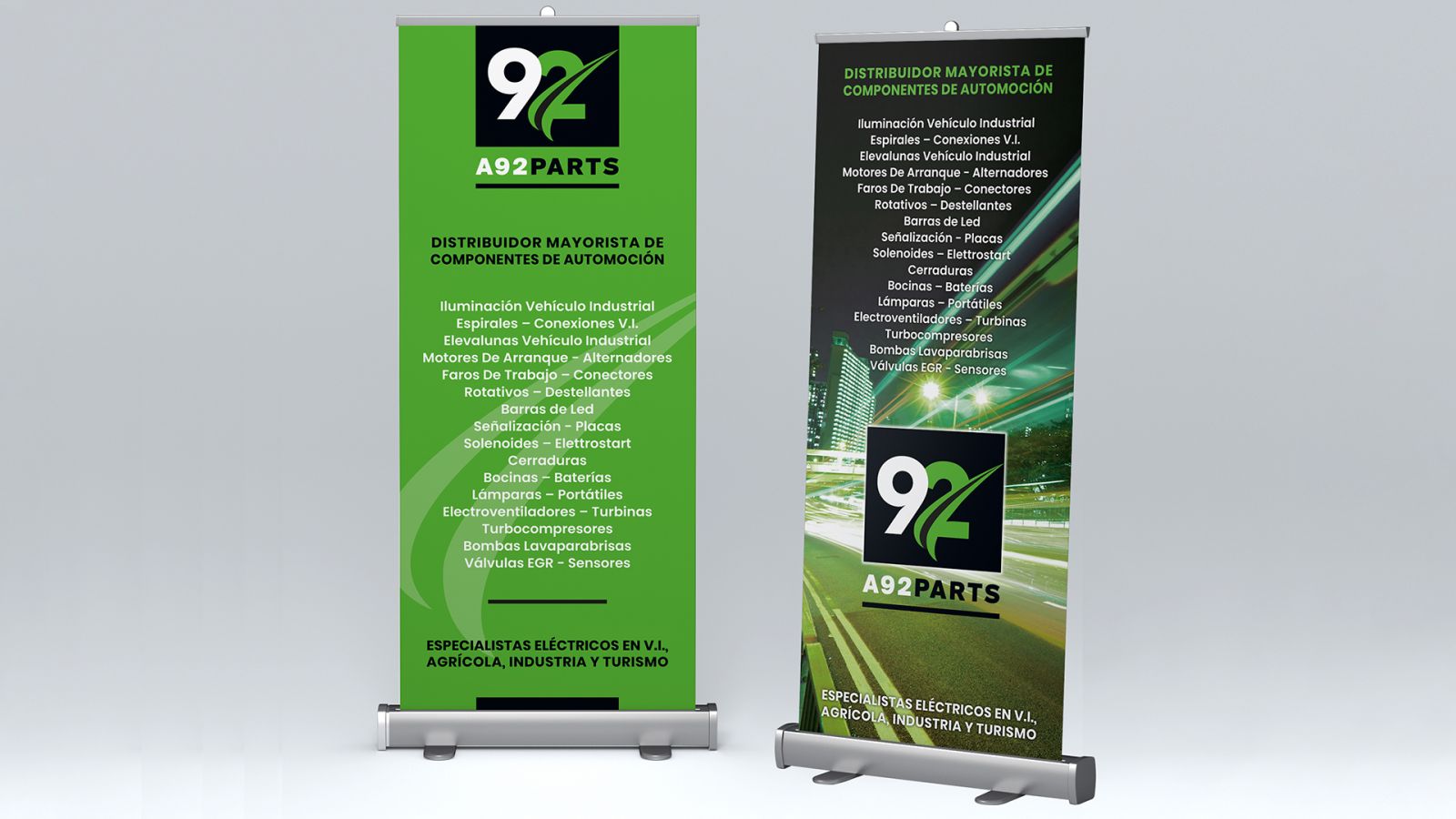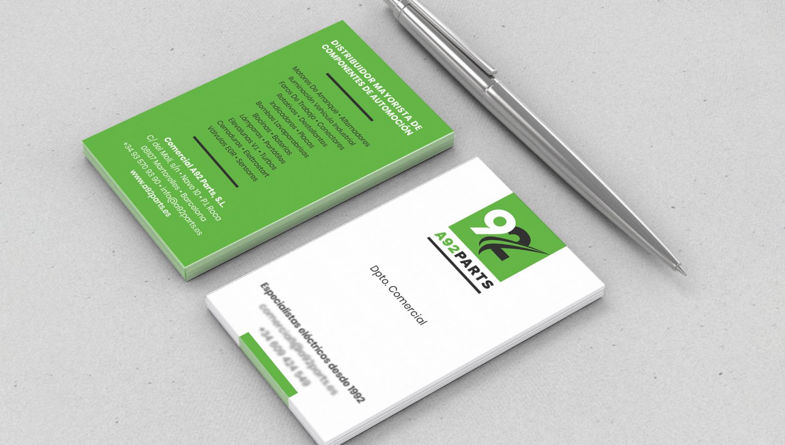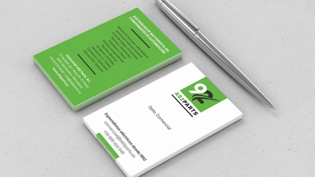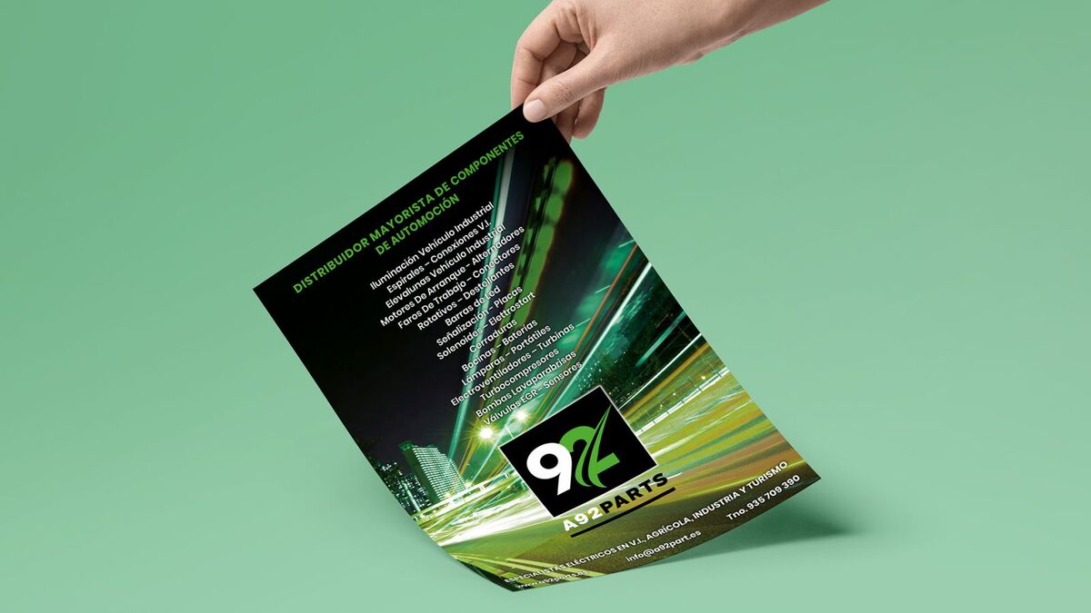 Empresa especializada en recambios eléctricos y electrónicos para automoción. Fundada en 1992 como Ager Auto, cambia en 2019 a A92 Parts. Diseño imagen, aplicación en papelería y soportes gráficos